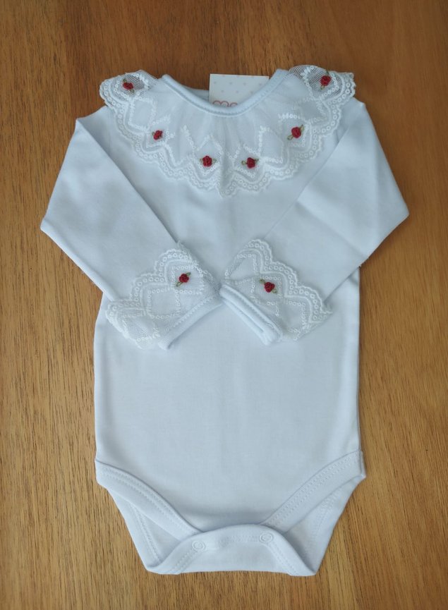 Body Manga Longa confeccionado em malha 100% algodão, ideal para compor com nossas saídas de maternidade. Com detalhe em renda e flores bordadas a mão na gola e nos punhos. Um verdadeiro encanto!