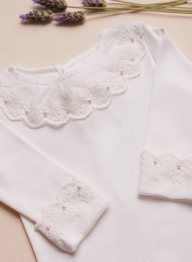 Body Manga Longa confeccionado em malha 100% algodão, ideal para compor com nossas saídas de maternidade. Com detalhe em renda e pérolas bordadas a mão na gola e nos punhos. Um verdadeiro encanto!
