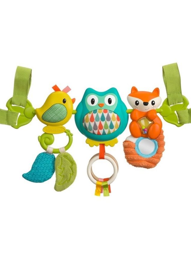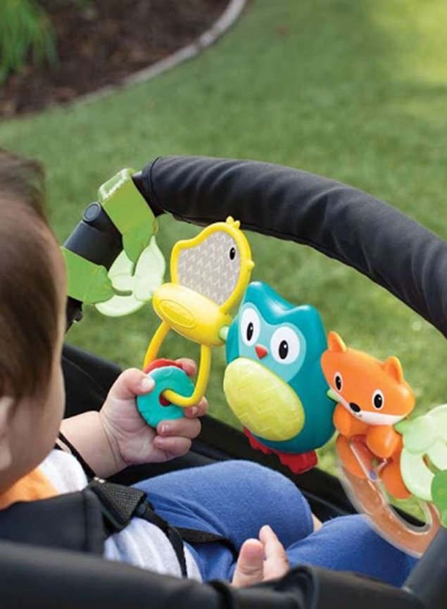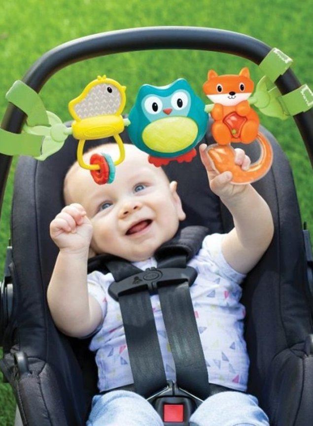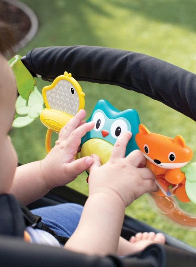 O brinquedo possui, chocalho, espelho, e amiguinhos com luzes e sons que giram 360 graus. É um brinquedo que pode ser acoplado ao carro, carrinho, cadeirinhas e afins.