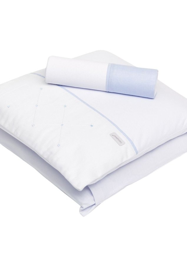 O conjunto contém um colchonete, uma capa bordada e uma fronha coordenados e a capa pode ser removida, o que facilita a higienização.