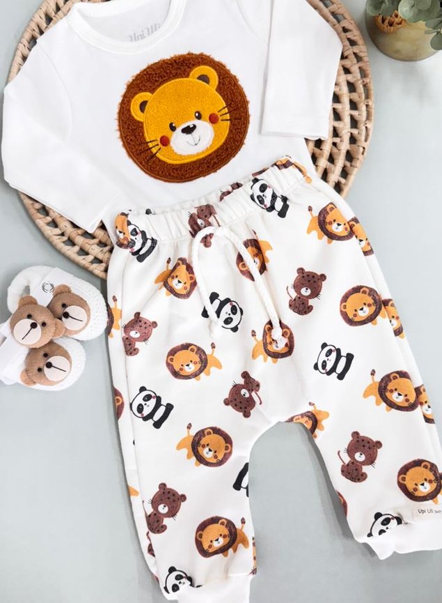 Esse conjunto é composto por body branco com bordado de leão e calça com estampa exclusiva de bichinhos, incluindo leão, panda e ursinho.
