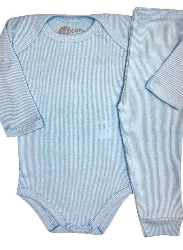 Lindo conjunto de calça e body manga longa em ribana canelada 100% algodão, body com gola envelope e abertura com botões entre pernas facilitando a troca do bebê. A calça é sem pezinho e cós com elástico.
