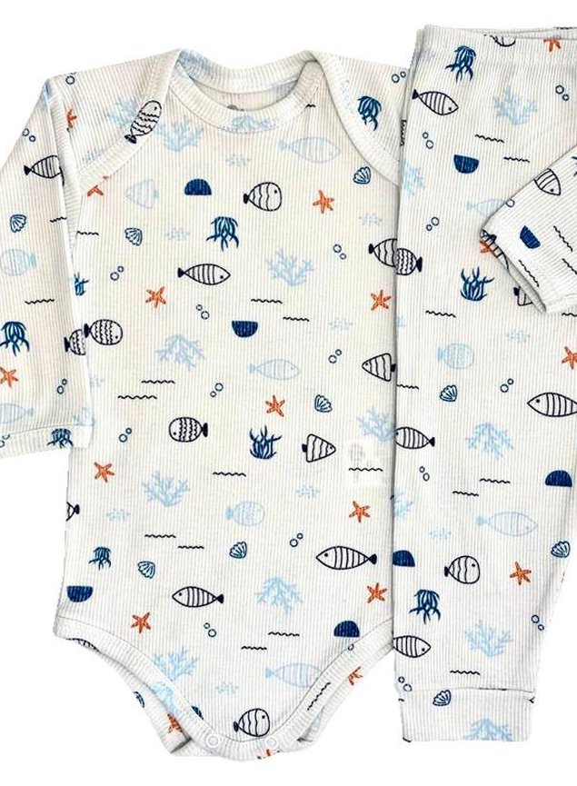 Lindo conjunto de calça e body manga longa em ribana canelada 100% algodão, body com gola envelope e abertura com botões entre pernas facilitando a troca do bebê. A calça é sem pezinho e cós com elástico.