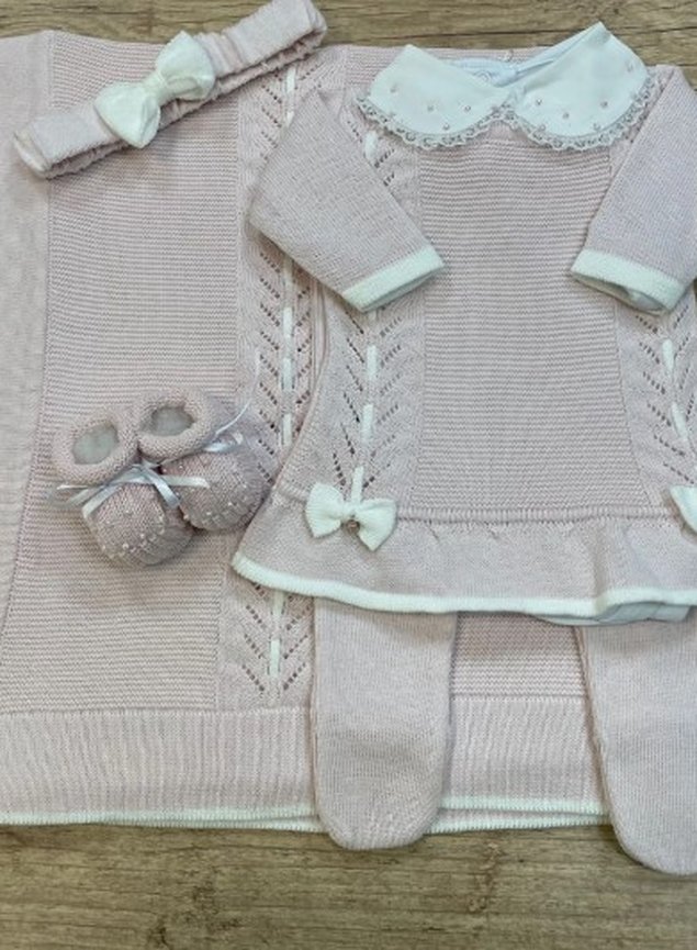 Mamãe, já vamos logo avisando que ela é irresistível! Ele é composto por 4 peças sendo 1 lindo vestido com trabalhado de tramas com lacinhos com pingentes. para dar aqueele charme especial. Também acompanha uma calça com pézinho e 1 manta com o mesmo detalhe trabalhado da trama do vestido e 1 faixinha de cabelo. Look digno de uma verdadeira princesa!