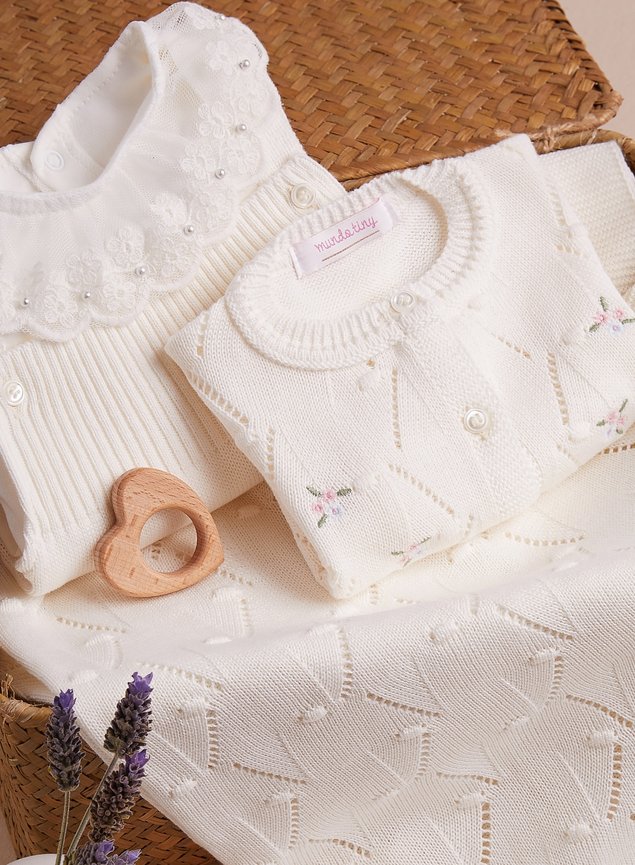 Mamãe, já vamos logo avisando que ela é irresistível! Ele é composto por 3 peças sendo 1 lindo casaquinho com bordadinho de flores com trama leve e delicada. Remete realmente toda a pureza de uma menininha que acaba de chegar ao mundo! Acompanha também uma jardineira super versátil e 1 manta com o mesmo detalhe trabalhado da trama do casaco. Look digno de uma verdadeira princesa!