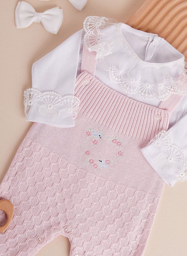 Conjunto composto por Jardineira com bordado e Body com detalhe em renda que dão o maior charme no look da sua princesa, além de ser súper confortável. Confeccionado em tricot em linha ideal para ser usado na maternidade. Produto antialérgico, com maciez ao toque, garantindo conforto ao bebê.