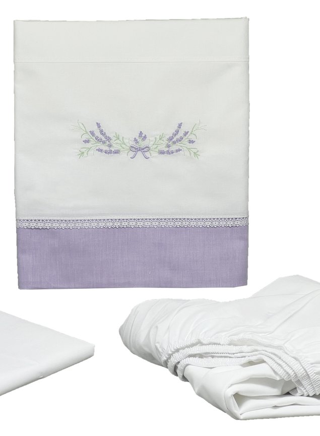 Um estilo clássico que encanta todas as gerações: lençol branco com barra lavanda e bordado.