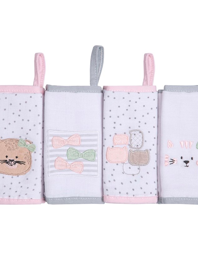 Seu tamanho de 37cm x 37cm é perfeito e ideal para levar em passeios com o bebê. Possui bordados fofos e delicados, possui 4 unidades no pacote.