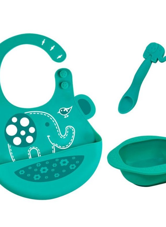 O conjunto de alimentação do bebê inclui uma tigela de silicone, uma colher de alimentação de ponta macia que é suave para a gengiva do bebê e um babador com coletor de migalhas.