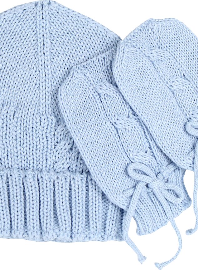 Conjunto de gorrinho e par de luvas em tricot com detalhe de tranças, ideal para a maternidade.