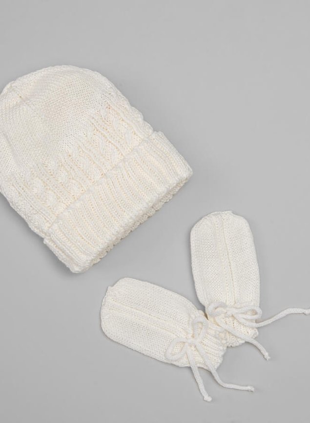 Conjunto de gorrinho e par de luvas em tricot com detalhe de tranças, ideal para a maternidade.