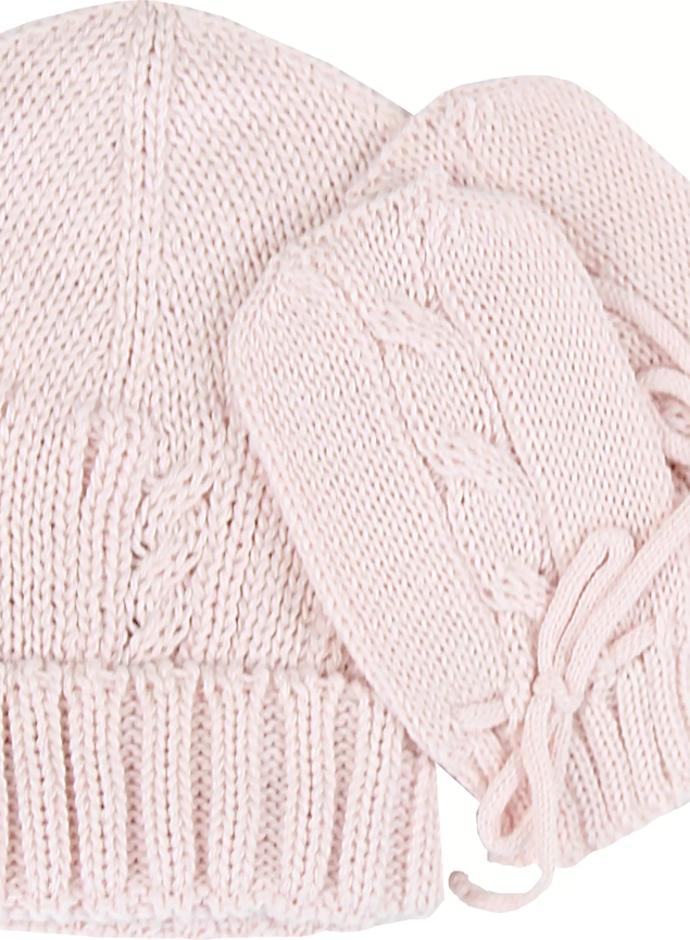 Conjunto de gorrinho e par de luvas em tricot com detalhe de tranças, ideal para a maternidade.