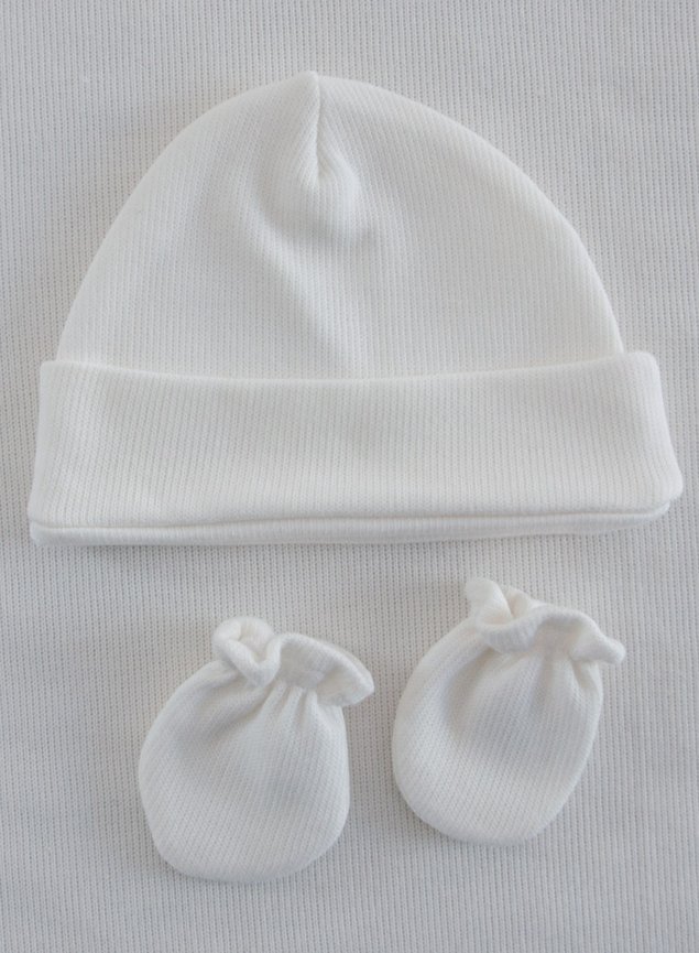 Conjunto de gorrinho e par de luvas em malha tricotada, ideal para a maternidade.
