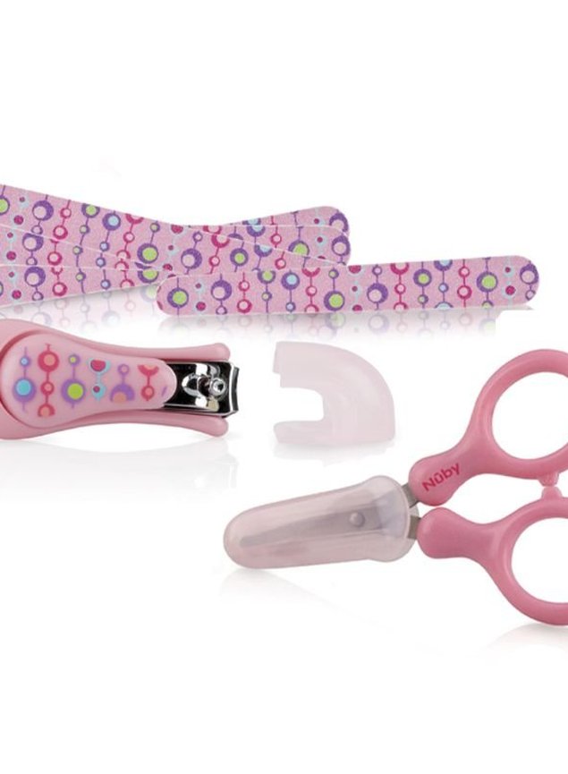 O kit de cuidados infantil da Nuby, consiste em 4 lixas de unha, 1 cortador, e 1 tesourinha com capa protetora, desenvolvidos especialmente para as pequenas unhas do bebê.