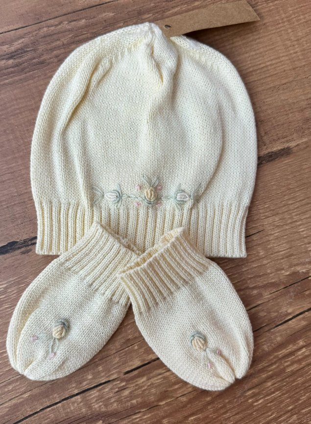 Esse lindo Kit de Touca com luvas todo bordado a mão darão maior charme e delicadeza ao look da sua bebê, além de manter a cabecinha e mãozinhas aquecidas.