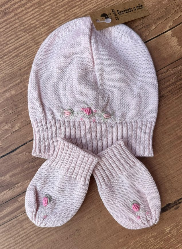 Esse lindo Kit de Touca com luvas todo bordado a mão darão maior charme e delicadeza ao look da sua bebê, além de manter a cabecinha e mãozinhas aquecidas.