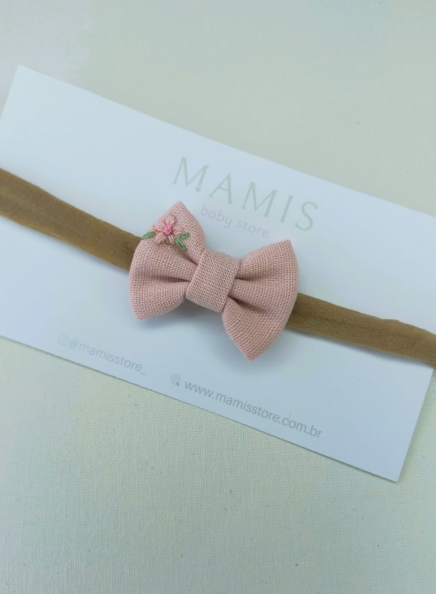 Lacinho de cabelo em linho, com bordado de flor, na faixinha nude para bebês com ou sem cabelos, não machuca a cabeça do bebê.