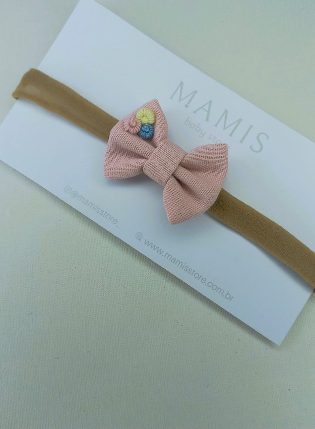 Lacinho de cabelo em linho, com bordado rococó, na faixinha nude para bebês com ou sem cabelos, não machuca a cabeça do bebê.