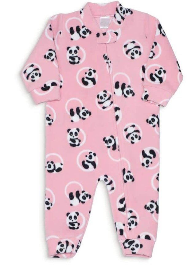 Macacão quentinho estilo pijama de soft para bebê menina rosa antigo com estampa rotativa de pandas. Conta com abertura frontal e fechamento na diagonal por zíper com cursor duplo, que permite abrir somente a parte de cima ou a de baixo.