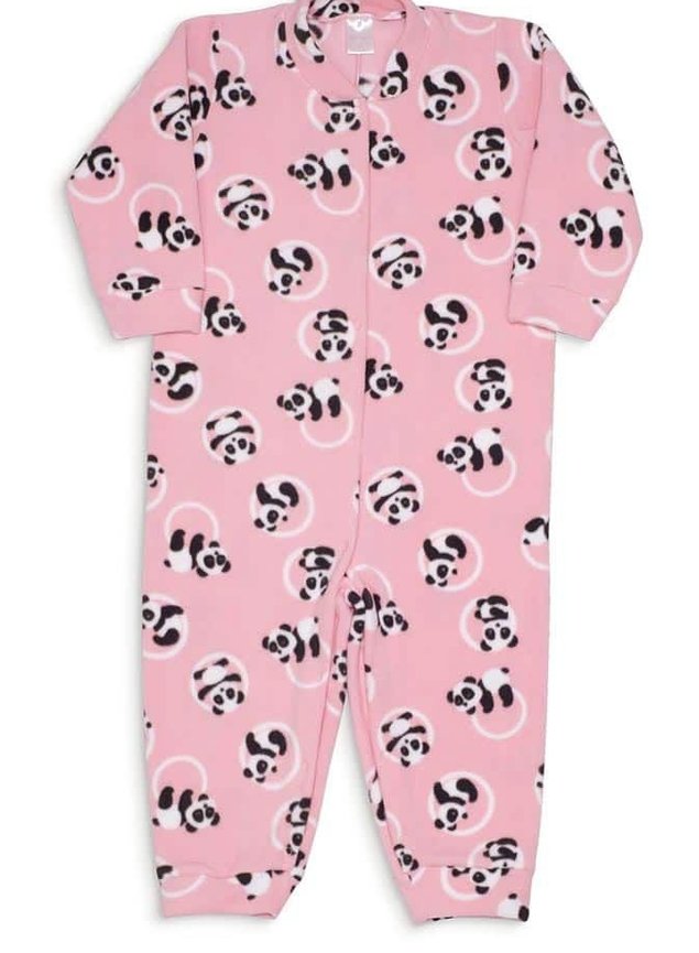 Macacão quentinho estilo pijama de soft para bebê menina rosa antigo com estampa rotativa de pandas. Conta com abertura frontal e no entrepernas.