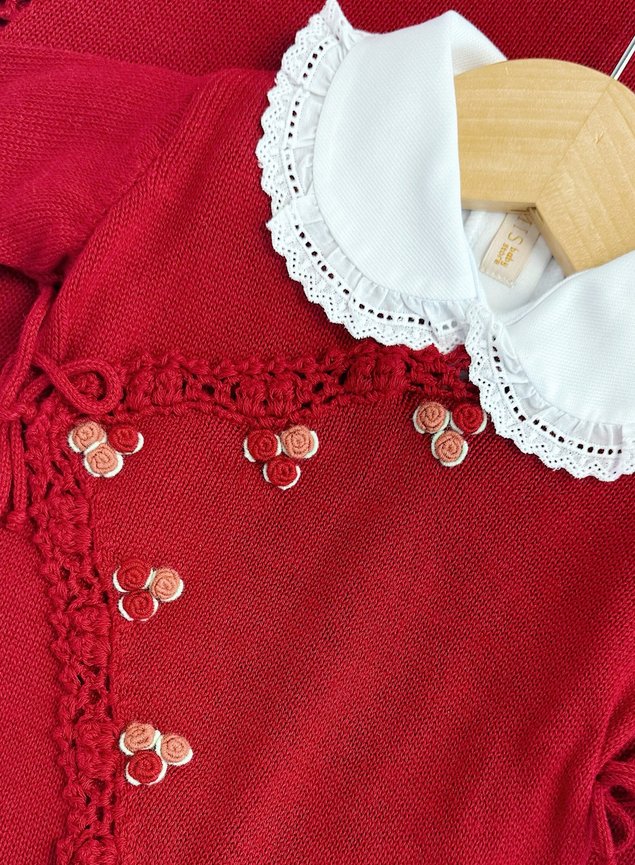 Macacão feminino de tricot transpassado com flores bordadas à mão. Possui abotoamento nas entrepernas para facilitar a troca do bebê. O kit perfeito para a mala da maternidade e os primeiros passeios da bebê.