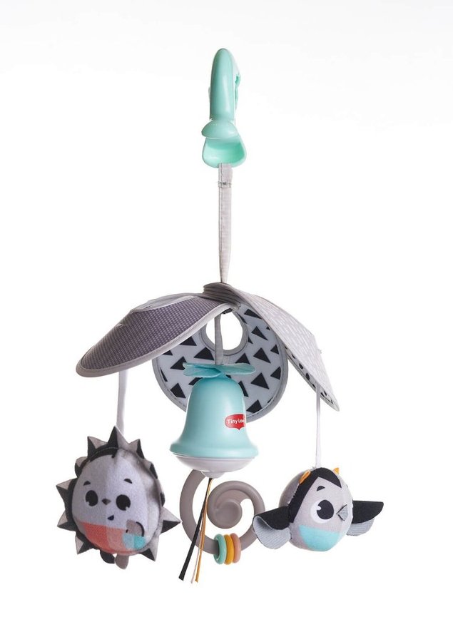 Móbile dobrável com som de sinos de vento, chocalho e espelho. Perfeito para prenderno carrinho ou moisés durante os passeios. Fácil de dobrar para levar aonde quiser.