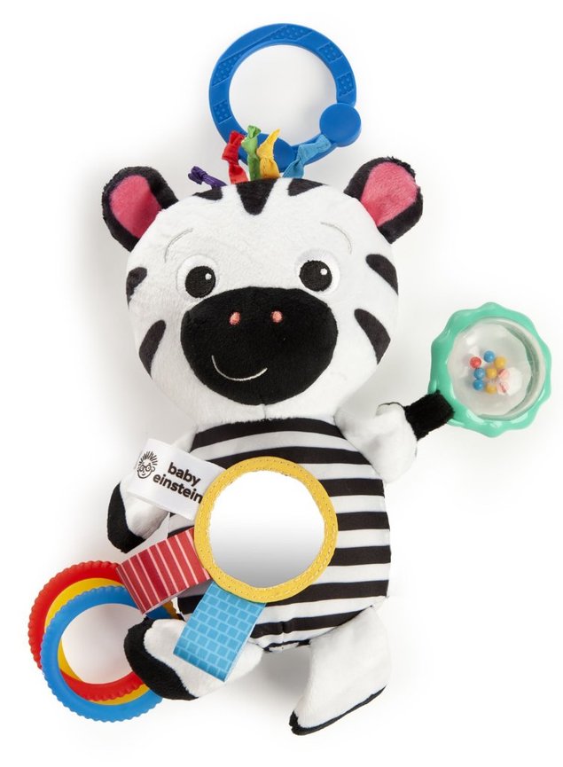 Um brinquedo capaz despertar a curiosidade do seu bebê com espelho, chocalhos e texturas variadas com formato de zebra.
