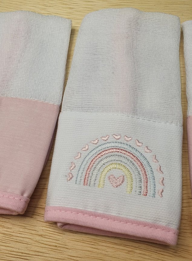 Nossos kits fraldinhas de 3 unidades são de tecido fralda 100% algodão. Uma delas com bordado e 2 lisas.