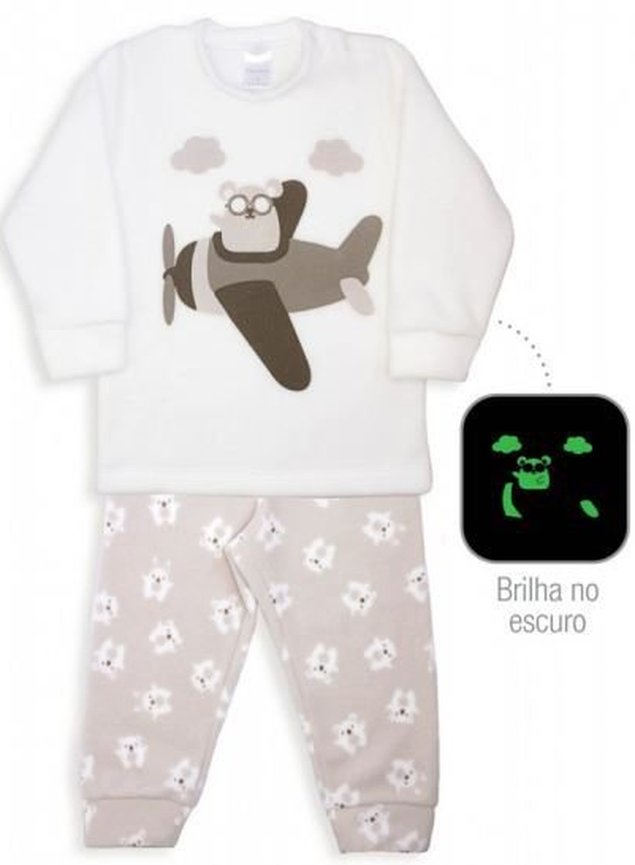Conjunto de soft estilo pijama quentinho infantil para menino composto por calça bege e estampa rotativa de bichinhos de pano e blusa marfim, com botões no ombro e estampa que brilha no escuro, localizada, à base d'água e não tóxica de bichinho de pano no avião.