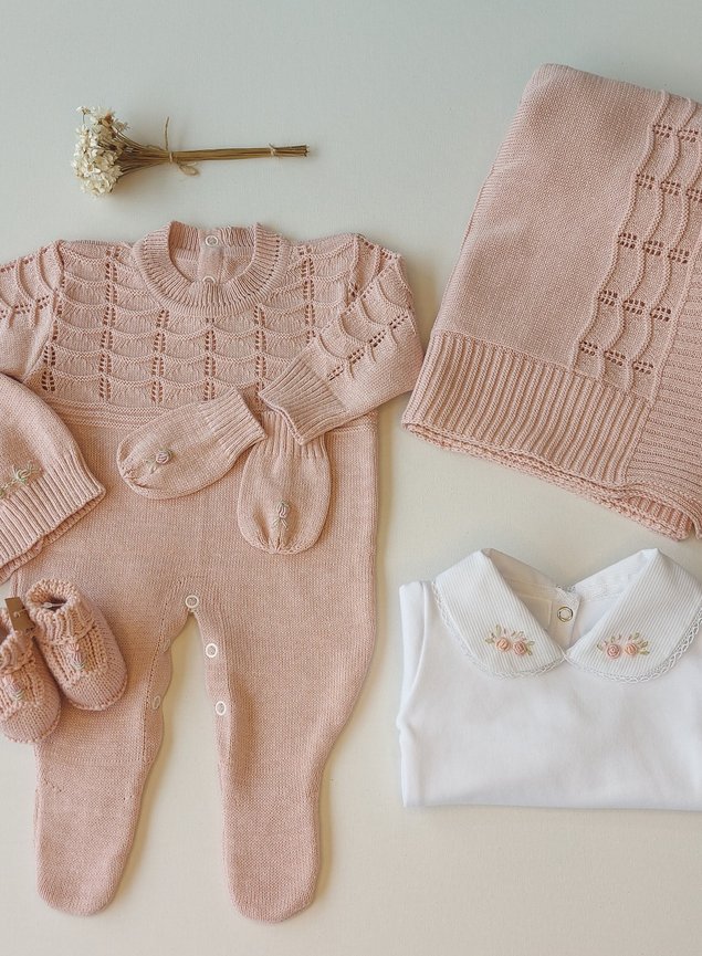 Nossa Saída Maternidade LÍVIA está um charme só! Ela é composta por 2 peças sendo macacão tricot com tramas delicadamente trabalhadas e a manta com o mesmo detalhe do macacão.