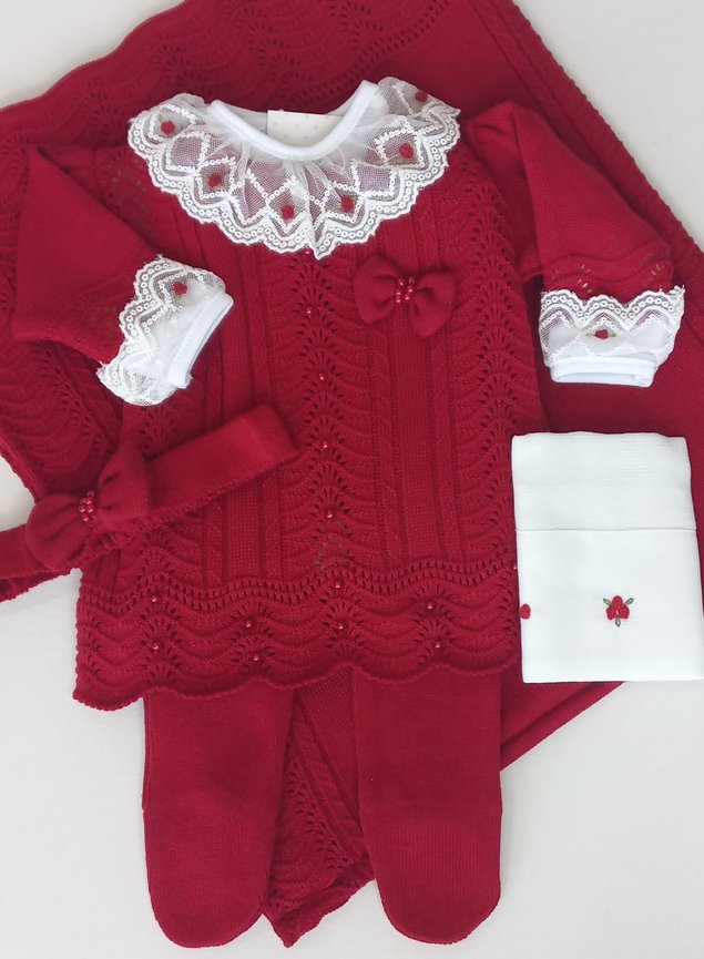 Nossa Saída Maternidade Marina é irresistível! Ela é composta por 4 peças sendo 1 lindo vestido com tramas delicadamente trabalhadas e pérolas borddas a mão + calça, faixa e manta com o mesmo detalhe do macacão.