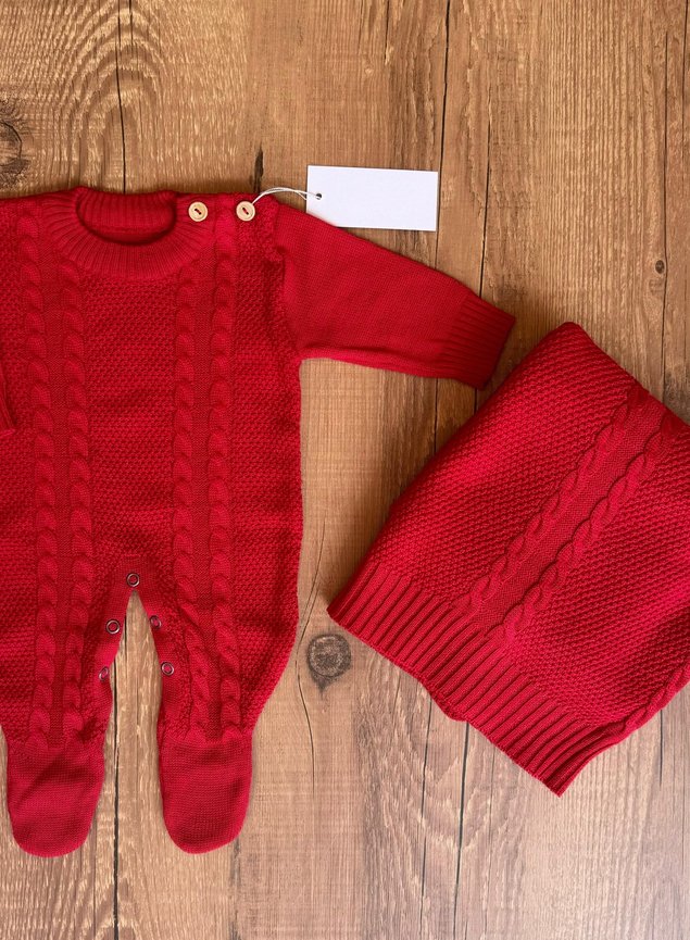Um charme só! Ela é composta por 2 peças sendo macacão tricot com tramas delicadamente trabalhadas a manta com o mesmo detalhe do macacão.