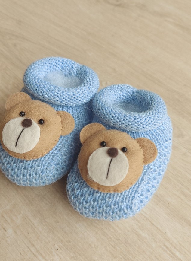 Lindo par de sapatinhos em tricot com aplique de ursinho que darão maior charme e delicadeza ao look do seu bebê.
