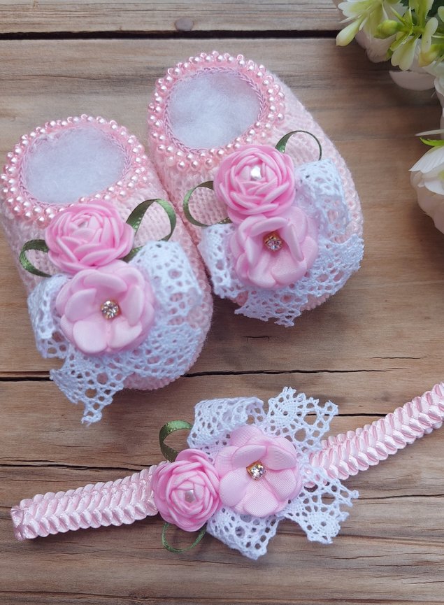 Esse Kit lindo de sapatinhos + faixinha de cabelo, com pérolas bordadas a mão, e aplique de flor e renda darão maior charme e delicadeza ao look da sua bebê.