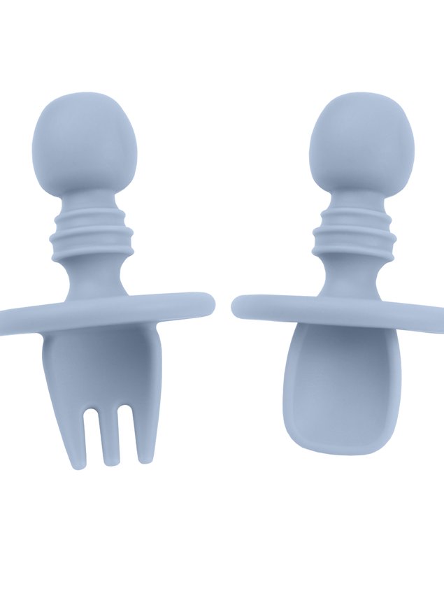 Kit de talheres infantis com um garfo e uma colher confeccionados em silicone macio e resistente.
